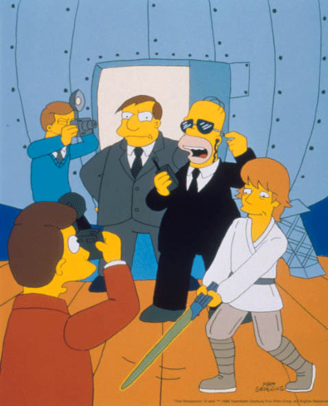 Os Simpsons estão assistindo televisão, enquanto aparece um comercial sobre uma feira que acontecera em Springfield. Na feira, aparece Mark Hamill falando sobre um provedor. Um fã logo diz para ele falar sobre Guerra nas Estrelas, e ele diz que vai chamar alguém para encenar uma cena da série.Um tumulto começa na platéia, e logo uma multidão se prolifera diante dele.